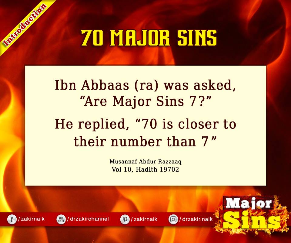 Praise be to Allah. Hadith about major sins in Islam. The Prophet (blessings and peace of Allah be upon him) explained the seven sins that doom a person to Hell i n a sahih hadieth that was narrated by the two Shaykhs, al-Bukhari and Muslim, in as-Sahihayn, in which it was narrated that the Prophet (blessings and peace of Allah be upon him) said: "Avoid the seven sins that doom a person to.