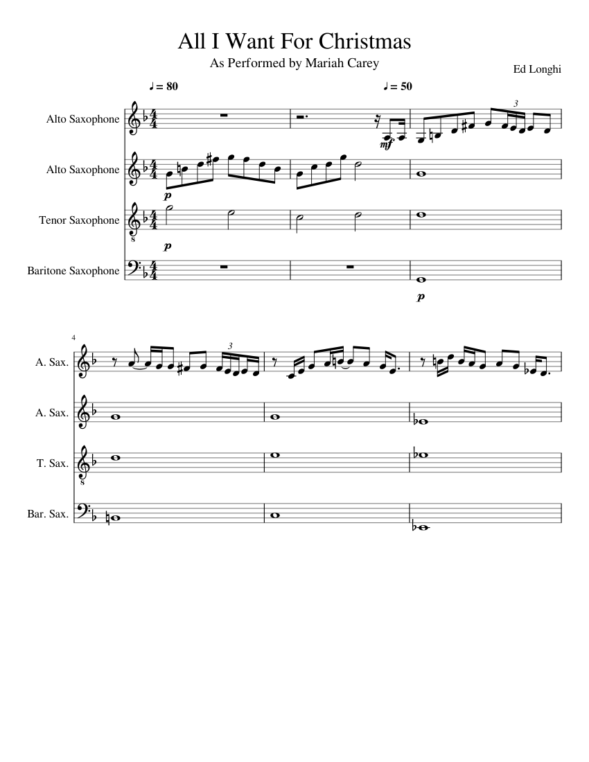 All I Want For Christmas Is You - Mariah Carey (Piano Solo) Official. Solo Piano. 108 votes. All I Want for Christmas is You - Mariah Carey (Jazz Ensemble) Mixed Ensemble. Saxophone Alto (2), Saxophone Tenor (2) and 10 more. 149 votes. All I Want For Christmas Is You - Mariah Carey.