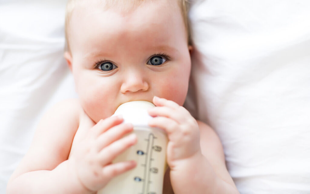 Baby Ligt Aan Zijn Kant En Drinkt Water of Melk Stock Afbeelding Image of voedsel, huis 217007005