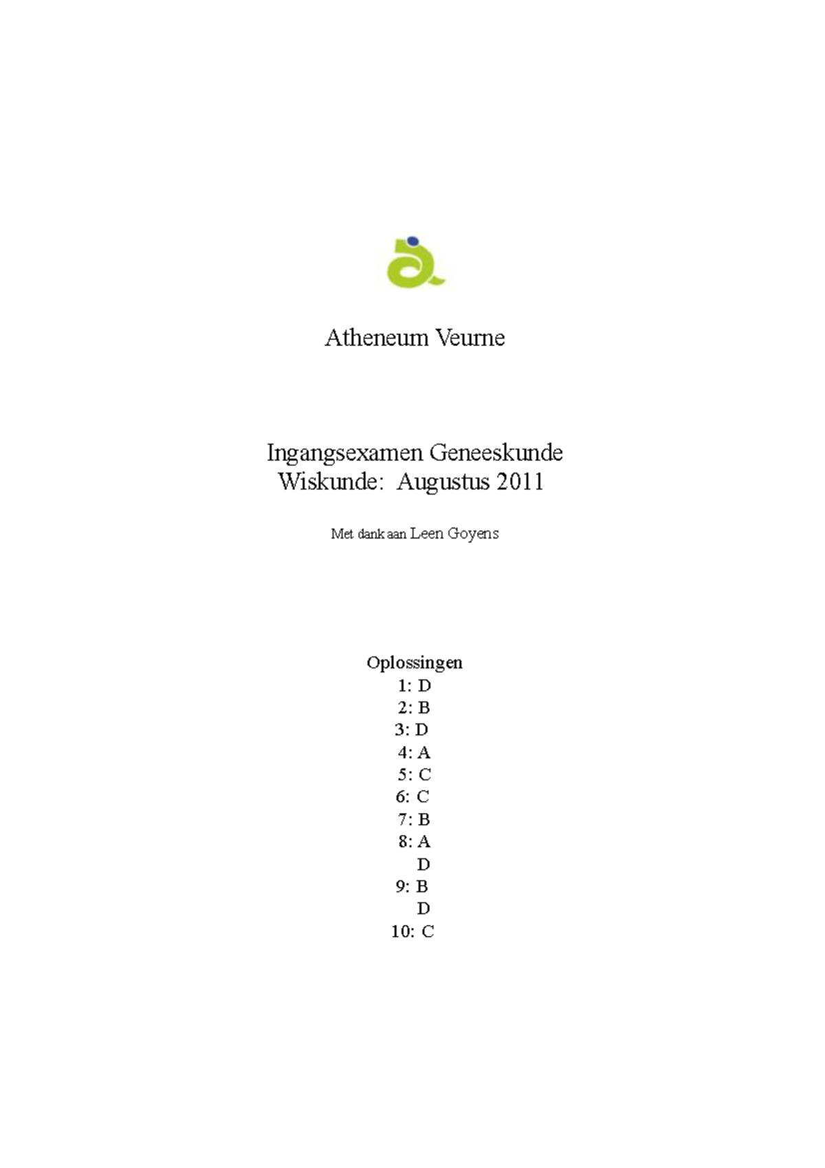 examen Augustus 2011 Atheneum Veurne Ingangsexamen Geneeskunde Wiskunde Augustus 2011 Met