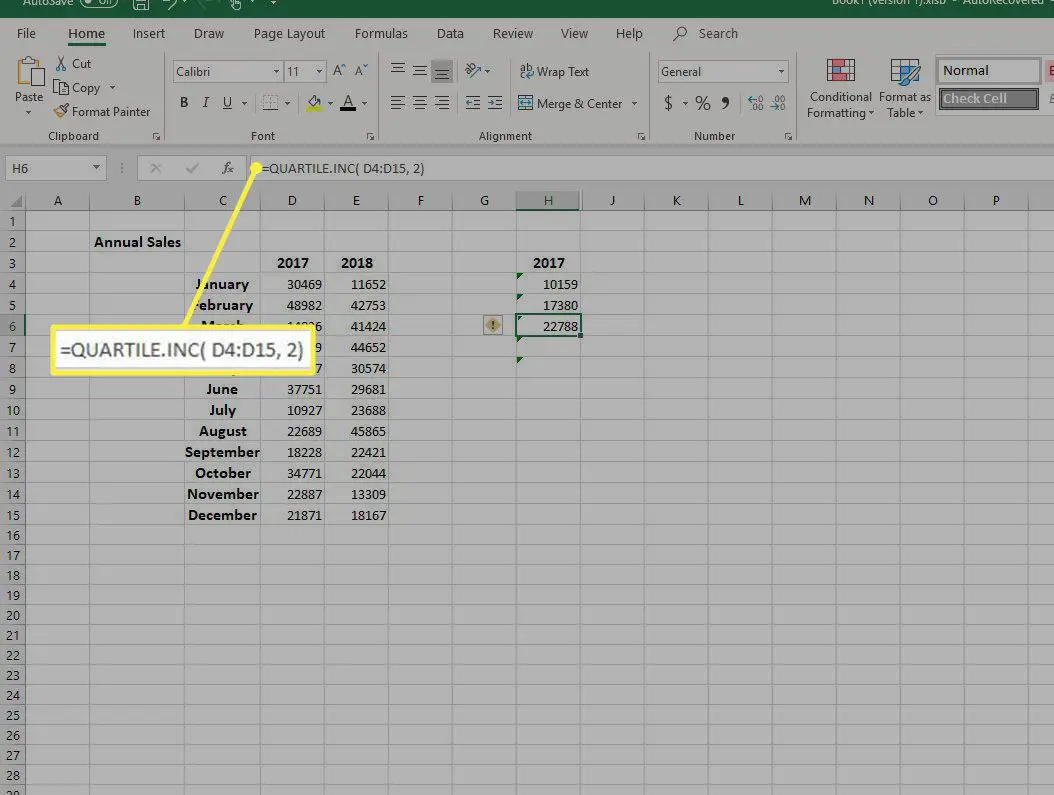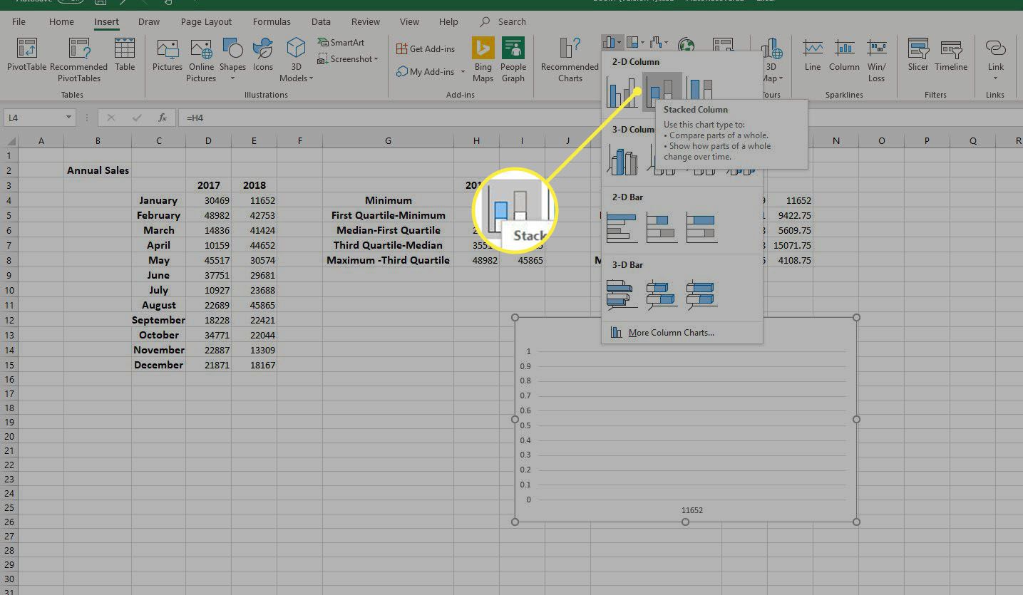 Stap 1: de kwartielwaarden berekenen. Stap 2: kwartielverschillen berekenen. Stap 3: een gestapeld kolomdiagram maken. Stap 4: het gestapeld kolomdiagram omzetten in de boxplotstijl. De onderste gegevensreeks verbergen. Whiskers maken voor de boxplot. De middelste gebieden een kleur geven.