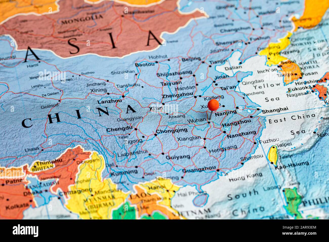 Clavija de mapa roja que Marca la ubicación de la ciudad de Wuhan, China Fotografía de stock Alamy