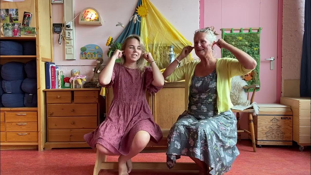 Videoclip met leidsters en kinderen van het kinderdagverblijf: Kijk eens naar je appel, kijk eens naar je peer, kijk naar je banaantje, er is nog veel meer…K.