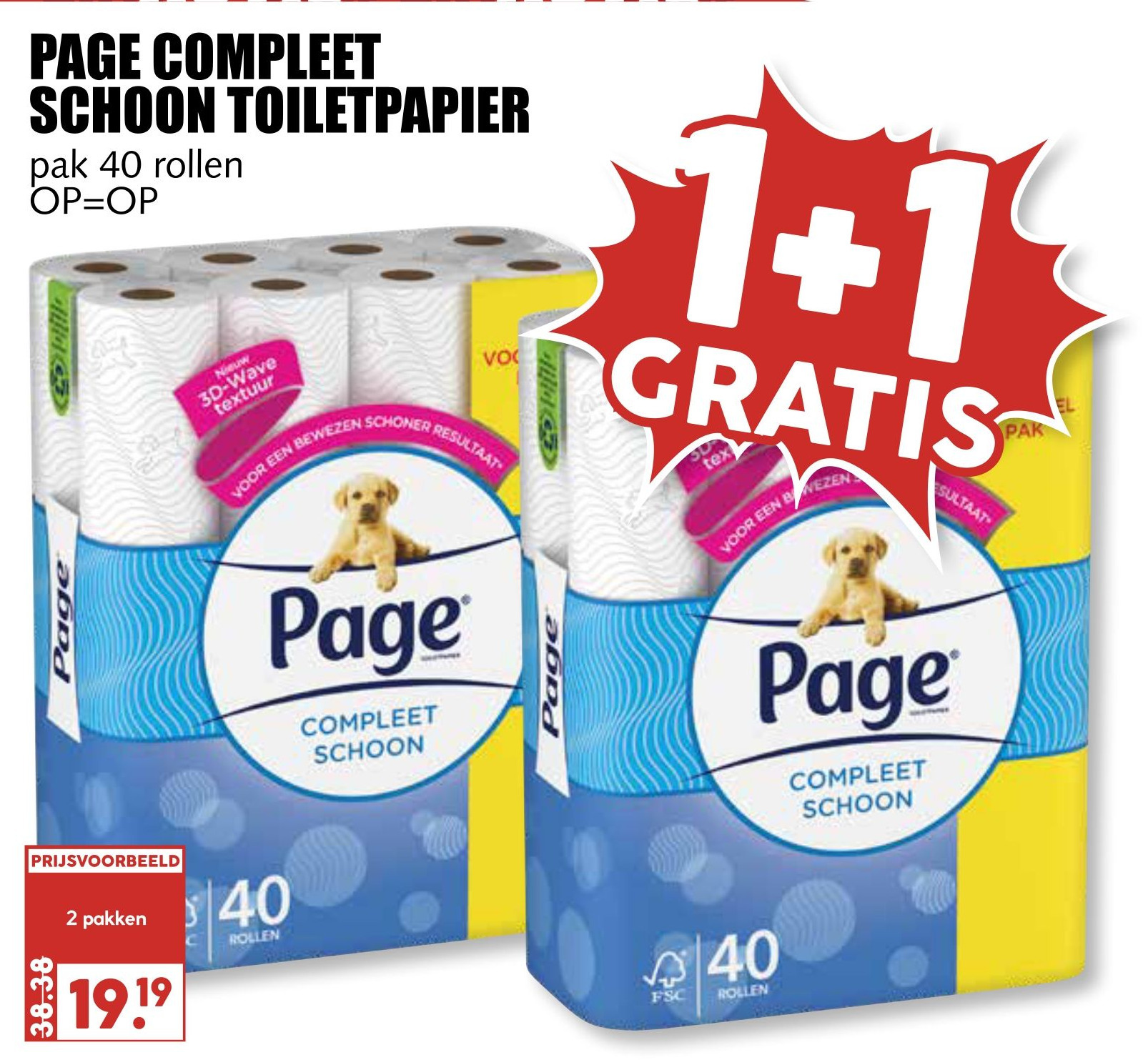 Page Compleet Schoon Toiletpapier 12-rollen; Extra informatie. Page compleet schoon toiletpapier is speciaal ontwikkeld om een schoner resultaat te geven als ooit tevoren. Het toiletpapier reinigt beter en helpt je daardoor minder te gebruiken.. 40 stuks. Page Compleet schoon toiletpapier. Leverbaar vanaf 21-05. Kies alternatief. 3. 99. 6.