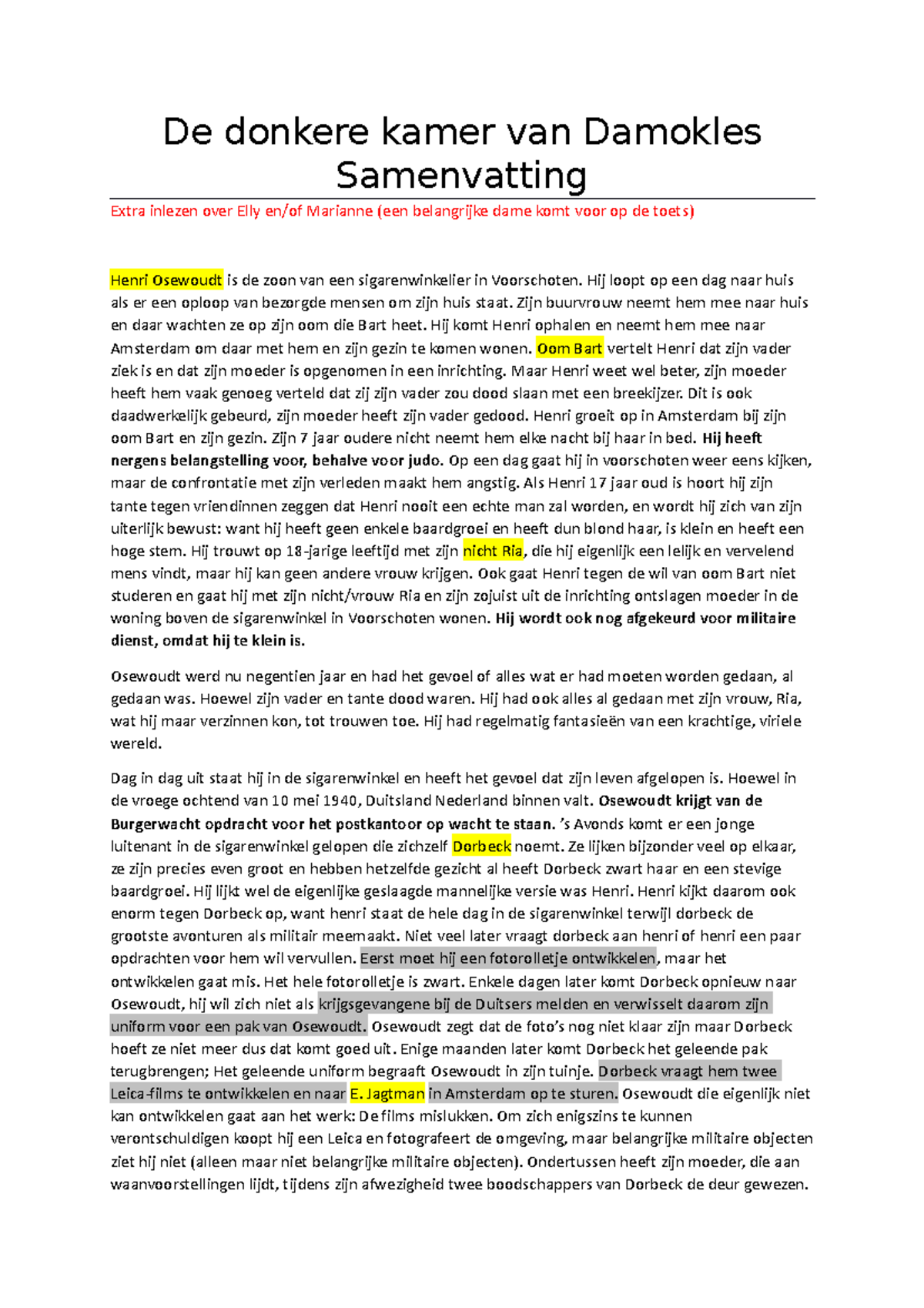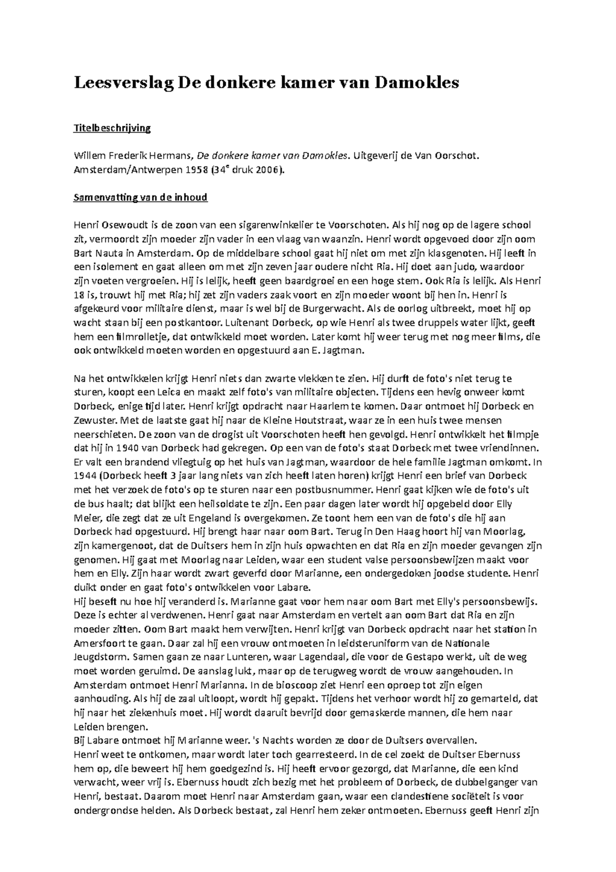 Samenvatting, donkere kamer van Damokles. Vak. Nederlands. 999+Documenten. Studenten deelden 1085 documenten in dit vak. Niveau • Jaar. VWO. • 4. School. Porta Mosana College - Maastricht. Info Meer informatie. Studiejaar:2022/2023. Boek in lijst De Donkere Kamer van Damokles. AuteurWillem Frederik Hermans. Geüpload door: Anonieme student.