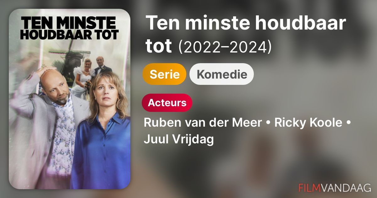 Ten minste houdbaar tot (televisieserie) Ten minste houdbaar tot is een Nederlandse Komische dramaserie van AVROTROS met Ricky Koole en Ruben van der Meer in de hoofdrol, die in hun relatie worstelen met de menopauze, midlifecrisis en hun kinderen die de deur uit gaan. De serie ging in première op 2 juni 2022 op NPO 1.
