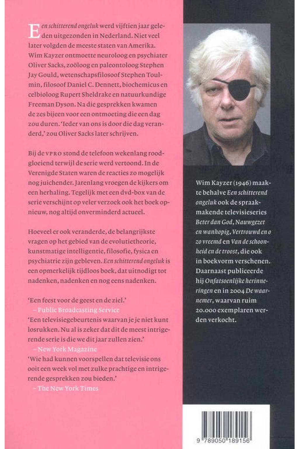 Een schitterend ongeluk werd 15 jaar geleden uitgezonden in Nederland. Niet veel later volgden de meeste staten van Amerika. Wim Kayzer ontmoette neuroloog en psychiater Oliver Sacks, zoöloog en paleontoloog Stephen Jay Gould, wetenschaps filosoof Stephen Toulmin, filosoof Daniel C. Dennett, biochemicus en celbioloog Rupert Sheldrake en.